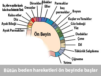 Gözlerin hareketi de ön beyinde başlar sonra göz kasları hareketi gerçekleştirir. Yine başın hareketi bu bölümde başlar sonra yüz kasları hareketi tamamlar. Bütün vücudun hareketi beynin bu bölümünde başlar kısaca.