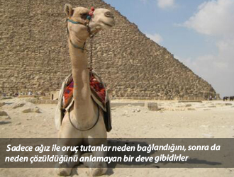Bir de organların orucu vardır. Ağzın orucu vardır. İnsanların genelinin orucu sadece ağızlarıyla tuttukları oruçtur. Tıpkı bir deve gibi, o deve bağlanmıştır ama neden bağlandığını da sonra neden çözüldüğünü de bilmez. İnsan da neden oruç tuttuğunu bilmez. Bilmiyor sana bunu kanıtla diyor. İyi ramazanlar, sonra bayram gelir nereye gider? Lazikiyye’ye gider deniz kenarında bir yazlık alır, yanına müzik dinlemek için ekipmanlarını da alıp denize gider, bayram yapar. Münafık bağlanıp, neden bağlandığını sonra da neden çözüldüğünü de bilmeyen bir deve gibidir. Bu cahillerin orucu, avamın orucudur. Onlardan olmaktan Allah’a sığınırız. İnşallah gelecek ders mübarek Ramazan ayına hazırlık olarak orucun hükümlerini ele almaya başlayacağız.