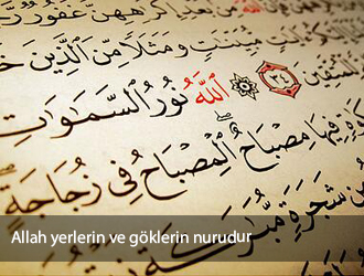 “Allah göklerin ve yerin nurudur. Onun nurunun misali, içinde kandil bulunan bir kandilliktir. Kandil bir cam içindedir, cam inciyi andıran bir yıldızdır; (bu kandil) doğuya da batıya da ait olmayan, yağı neredeyse ateş dokunmasa bile ışık veren mübarek bir zeytin ağacından yakılır. Nur üstüne nur. Allah nuruna dilediğini kavuşturur. Allah insanlar için misaller veriyor, Allah her şeyi hakkıyla bilmektedir.”