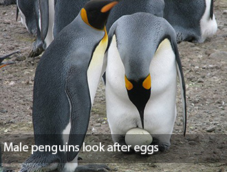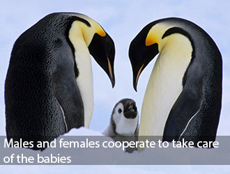 Learn from penguins how they share life. The female comes from the sea to take its baby and looks after it after it fills its craw with food from the sea, and the male in turn goes to the sea to fill