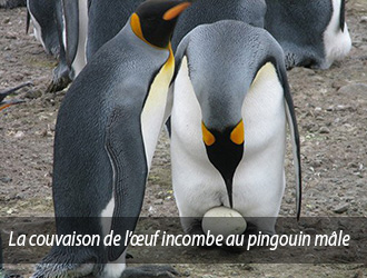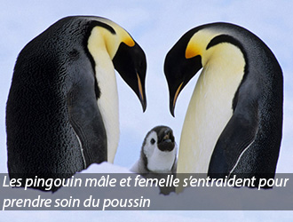 Aujourd'hui, ses enfants sont dans la rue, alors qu'elle est chez les voisins ; cet animal l’emporte sur cette mère négligente, il reste debout à couver l'œuf quatre mois de suite et en le couvrant de sa fourrure, n'avalant rien dans son bec pour procurer la chaleur nécessaire à l'embryon. A l’éclosion de l’œuf, le pingouin père introduit la nourriture dont il avait tellement besoin durant ces quatre mois dans le bec de son petit.