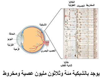 يوجد بالشبكية مئة وثلاثون مليون عصية ومخروط، بالميليمتر مربع