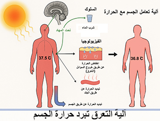 العرق يخرج الماء فيمتص حرارة الجلد، بهذه الطريقة يتعدل الجلد في حرارته.
