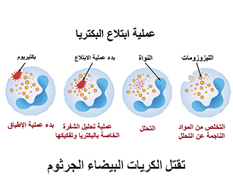 هذه الكريات البيضاء بعضها استطلاعي، بعضها تصنيعي، بعضها قتالي، بعضها خدمي، مهمة بعض هذه الكريات أن تستطلع بنية الجرثومة الداخلة، تأخذ شفرتها الكيماوية، وتعود بها إلى مركز العُقَد اللمفاوية كي يُصنّع المصل المضاد لهذه الجرثومة،