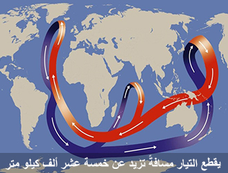 وقد يقطع مسافةً تزيد عن خمسة عشر ألف كيلو متر، فهذا الماء الذي تجده في البحر، ماءٌ متبدِّل، يقطع رحلاتٍ طويلة، بعضها إلى الشمال، وبعضها إلى الجنوب، بعضها إلى الشرق، وبعضها إلى الغرب، وهناك قوانين معقدة جداً، تحكم حركة الماء في المحيطات .