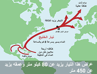 عرض هذا التيار، يزيد عن ثمانين كيلو متر، وعمقه يزيد عن أربعمئةٍ وخمسين متر ، وهذا التيار كثافته أربعة ملايين طن من الماء في الدقيقة، وهذا التيار، ماذا يفعل؟ يذيب مئة وثلاثين ألف طن من الكتل الثلجية في عشرة أيام من كتل ثلج القطبين، ولهذا التيار فوائد لا تعد ولا تحصى، إنه يجعل المنطقة الباردة في أوروبا منطقةً معتدلة، الأجواء اللطيفة في دول إسكندافيا سببها تيار الخليج .